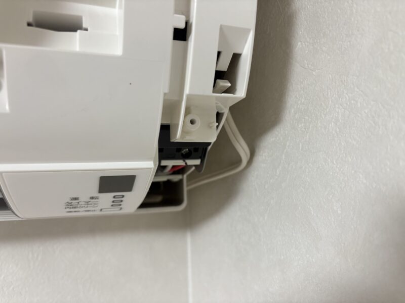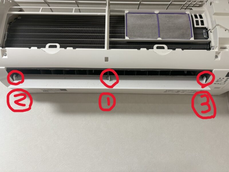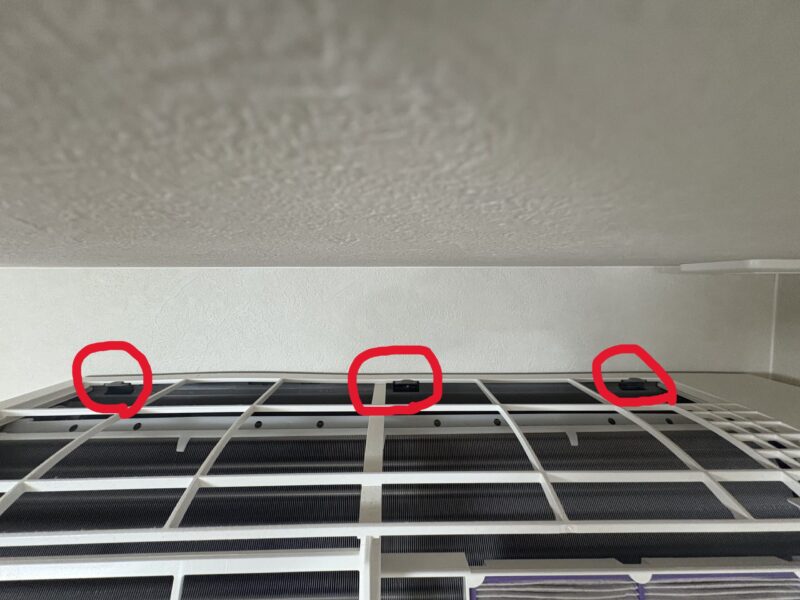 エアコン上部にツメが3か所あるからそれを手で外しながら本体カバーを手前に引く。左ツメを外して少し手前に引く。右ツメを外して少し手前に引く。中央ツメを外して手前に引く。こうすれば本体カバーを外すことができる。