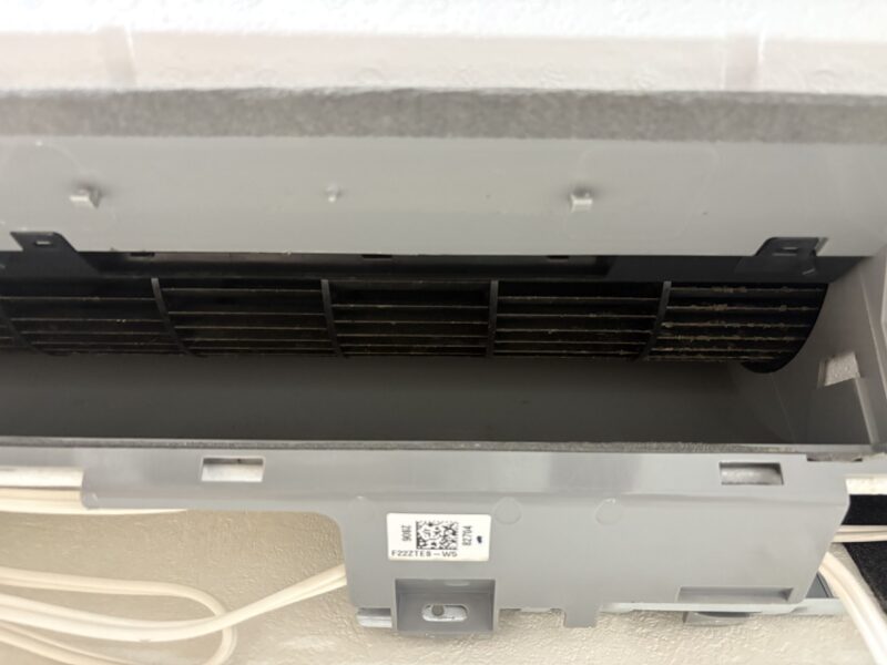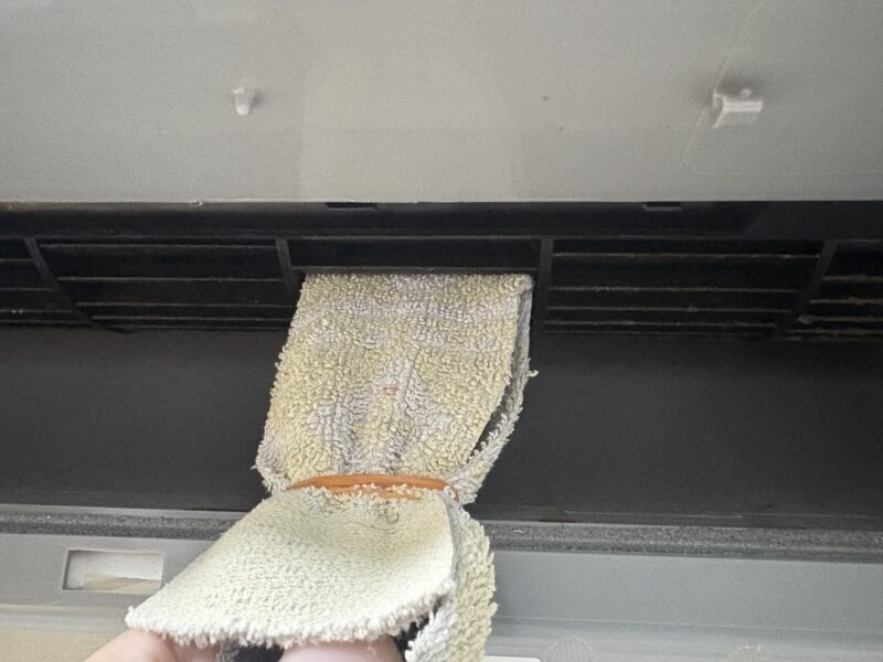 清掃前の状態。汚れの程度はひどくない方だとは思っているが学んだことが1つある。それは冷房を5月から10月まで連続運転していても黒カビが発生するということ。エアフィルター掃除以外は全く停止していないし送風や暖房も全くしていない条件で発生した。僕は冷房連続運転をしていたら黒カビは発生しないと考えていたから衝撃をうけた。