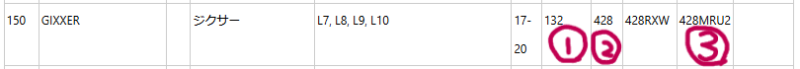 適合チェーンの確認方法は公式サイトを見ればok。上画像の①がリンク数、②がチェーンサイズ、③が型式となっている。